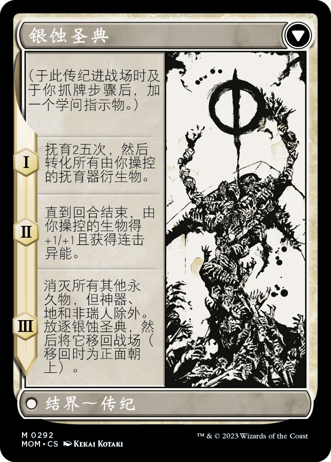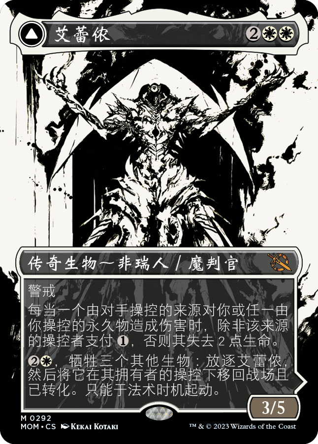 本节重温课程的最后一件事:法术力值。虽然背面没有法术力费用,但其法术力值也会根据其正面的法术力费用来确定。因此,银蚀圣典的法术力值和艾蕾侬相同。都是4。感谢大家跟我一起重温旧知。现在回到新内容上!
