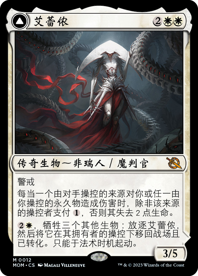 转化式双面牌(我们内部简称为TDFC)当其不在战场上时,就只具有其正面的特征。也就是说,如果你要从你牌库中搜寻一张生物牌,则你能找到艾蕾侬,但如果你要搜寻一张结界牌的花,你找不到银蚀圣典。你总是施放其证明,且除非有效应明确说明其他状况(例如艾蕾侬的最后一个异能),否则TDFC均是正面朝上地进战场。