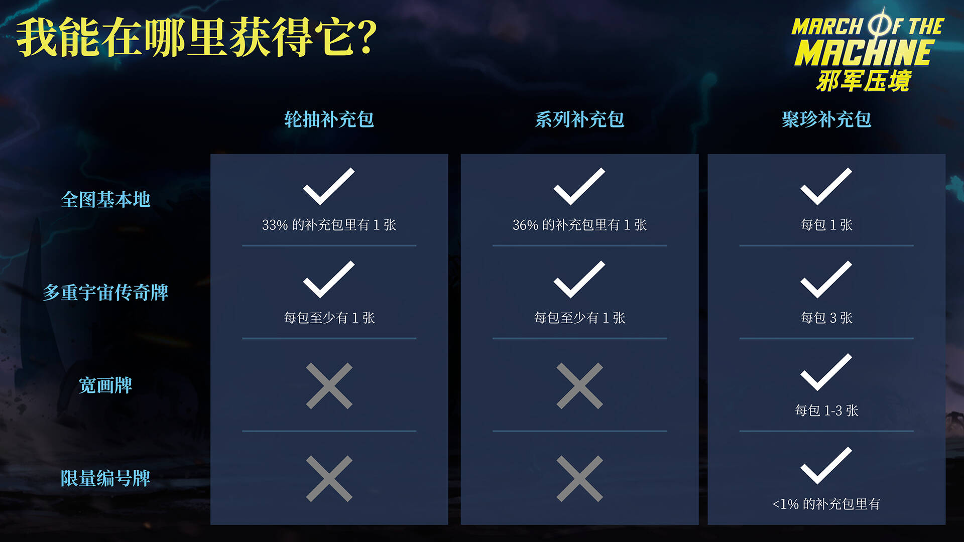 这些牌张印量少且极具收藏价值:不到1%的聚珍补充包中会出现一张限量编号多重宇宙传奇牌。