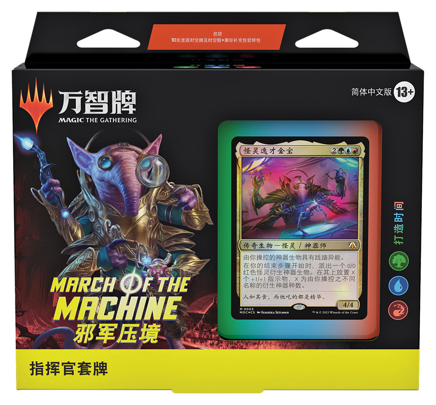 竞逐时空回归万智牌,相关牌张会加入邪军压境指挥官套牌。(如你对此不甚了解,Gavin Verhey撰写的文章中详细介绍了竞逐时空的玩法及其受欢迎的理由,请务必一读。)每副指挥官套牌内含十张该套牌特有的大型竞逐时空牌:其中五张为新加入万智牌的竞逐时空牌,另外五张为竞逐时空重印牌。邪军压境指挥官套牌共有五副,购买全套即可集齐所有竞逐时空牌张。