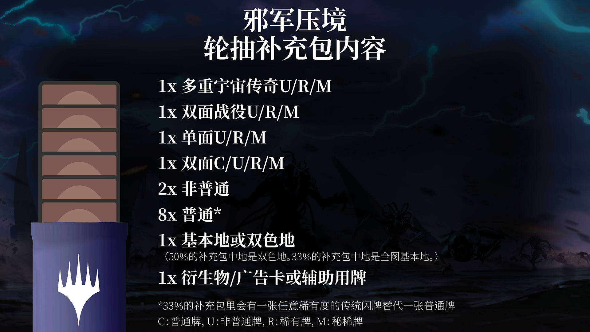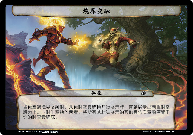 来自多重宇宙各个时空的熟悉面孔会悉数登场,有的会和非瑞人联手战斗——有的则会誓死反抗。每包系列和轮抽补充包内都有一张多重宇宙传奇牌。这些牌无法用于标准赛,每张均为重印牌,可用于该牌原本允许使用的赛制,也可用于邪军压境现开和轮抽赛。每张多重宇宙传奇牌均配有代表其对应时空的补充包添趣处理——共计十六个时空。全部十六种牌张处理如下所示,更多多重宇宙传奇牌会在之后展示: