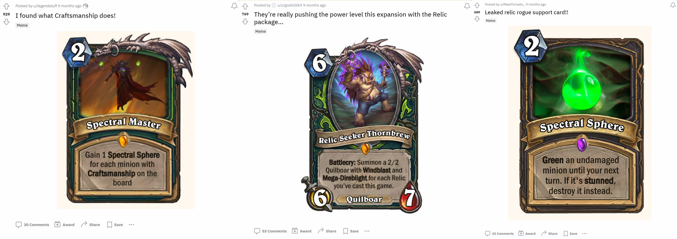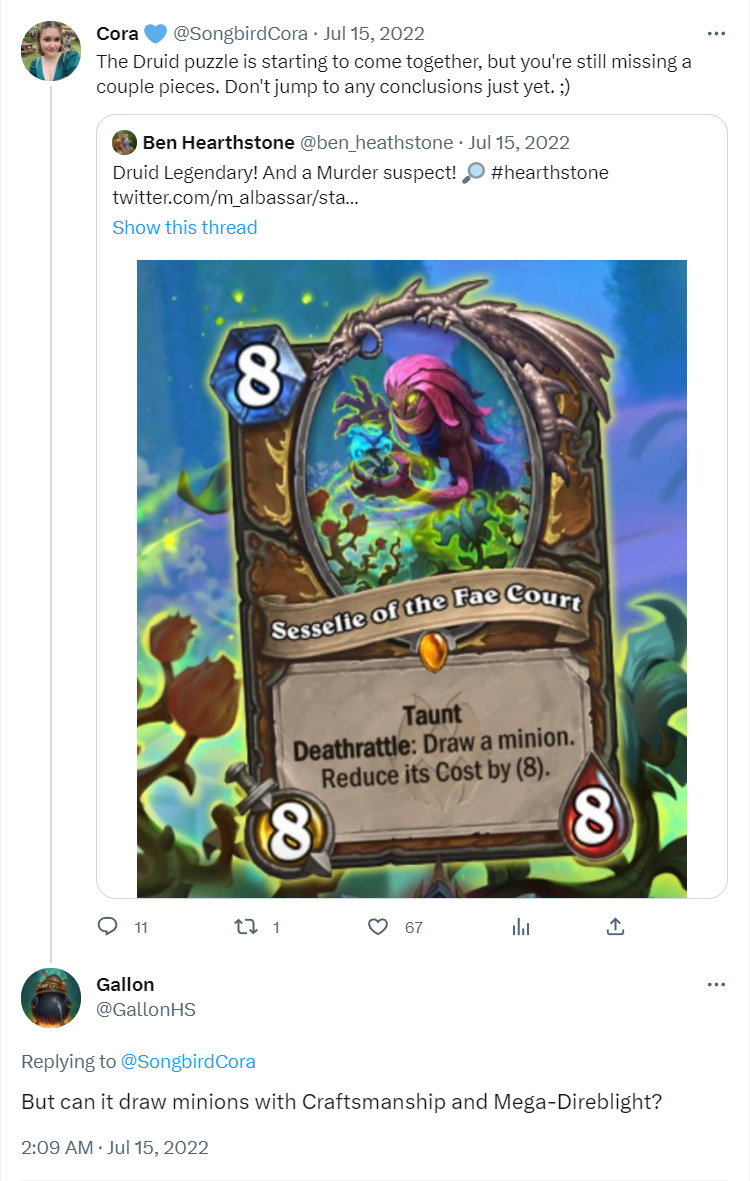 【纳斯利亚堡预览季时圣物牌只首发了一张地标,引得社区纷纷猜疑,当时Reddit上最火的一些恶搞剩余圣物牌的卡图里就包含了“Craftsmanship”“Direblight”和“Green”这些不明觉厉的字眼。后来法夜朝臣瑟赛莉公布时也是德鲁伊大亡语体系里第一块公布的组件,Cora也叫大家等组件出完了再下判断,这时Gallon就在回复里内涵瑟赛莉也成了第二个圣物地标。另外注意这篇愚人节特辑就是由Gallon主笔的】