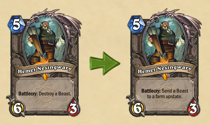 开发者注:赫米特·奈辛瓦里的效果对《炉石传说》来说有点太过限制级了,因此我们便对其进行更新,让他变成一张未成年也能使用的卡牌。