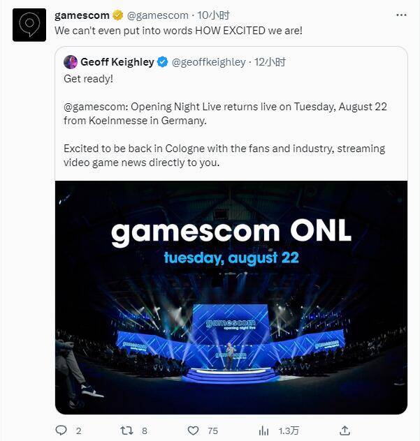 2023科隆游戏展的展前开幕夜“Opening Night Live”将在 8月22日回归,由Geoff Keighley 担任主持人。