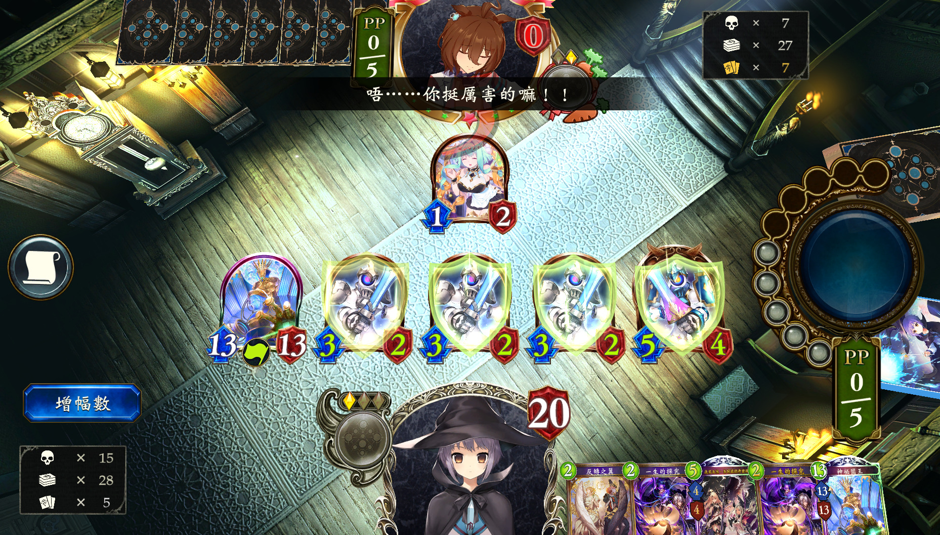 预计对手难以解场的话,可以在第2回合使用神秘皇后·梅迪。她站住场后,根据手牌情况,优先使用随从以获取奇幻战略(手中资源不足),或使用法术以召唤奇幻士兵(手中资源足够)。