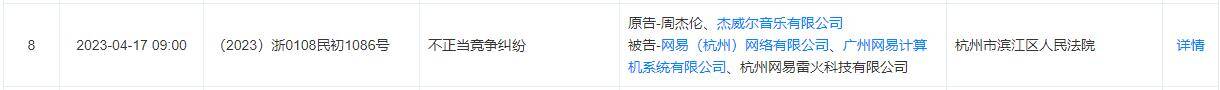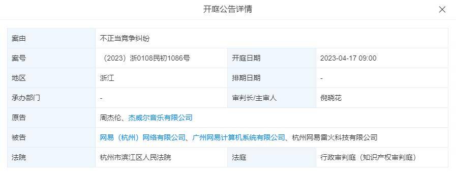 近日,天眼查显示,周杰伦及杰威尔音乐有限公司起诉网易(杭州)网络有限公司、广州网易计算机系统有限公司、杭州网易雷火科技有限公司,案由为不正当竞争纠纷,该案将于2023年4月17日在杭州市滨江区人民法院审理。