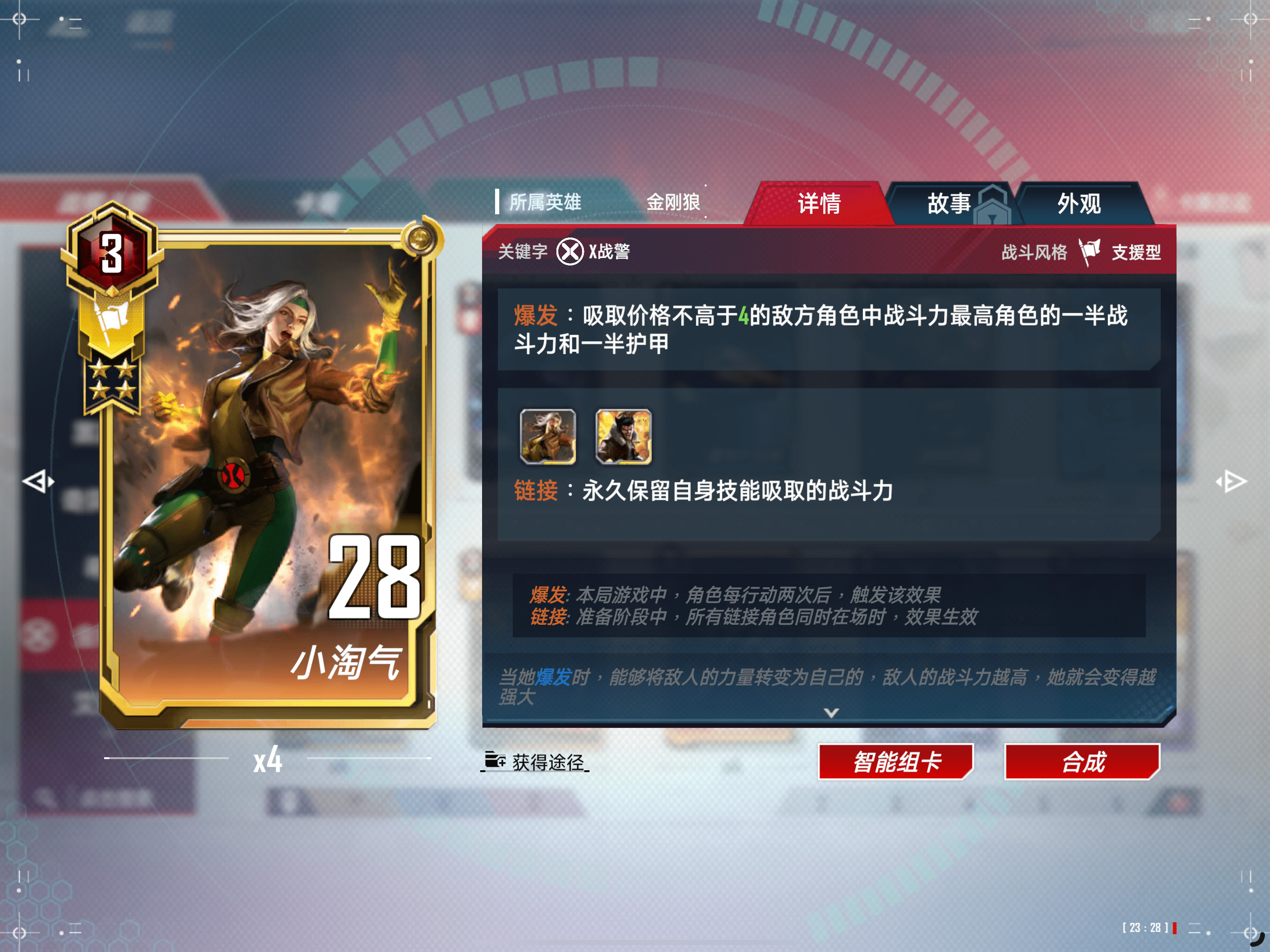 2费,野兽前期觉醒后战斗力非常高。心灵感应用于给小淘气,让她在战斗中直接启动,快速削弱对方战斗力,必要时可以给金刚狼,让他快速觉醒,提高战斗力,这张卡还具有自动刷新功能,节省了刷新的两宝石,相当于直接过滤了一张牌,非常好。