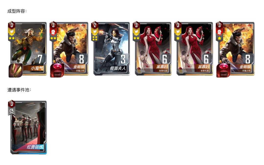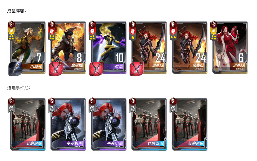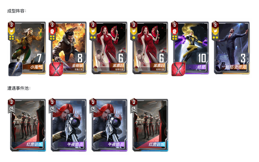 3费,红方决战,比红房训练收益更大。新春寡四张带满,前中期不和4,可以2+1,这样可以大量收集间谍舞会和一次性的狙击枪,方便中期保血。五本之后再和4,给暗星或者托尼腾出地方,还可以碰出一张6费牌。