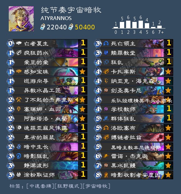 最不动脑子的构筑方式就是低费解、脏牌、组合技一通乱塞的40张宇宙脏牧:把所有针对牌塞一起,然后把所谓对谁都能五五开的通用性寄托在发牌员给脸上,而完全忽略本来就羸弱的牧师过牌在失去暗影以外法术后,在定向滤牌上等于一个失去了轮椅的瘸子。传统宇宙牧靠58上手+组合技otk的思路在别人的强度膨胀面前早就山穷水尽了,笨得不行。能批判的点太多太明显,以至于我不想也觉得没必要在这里长篇大论。暗牧以限定法术牌到暗影为代价,换来了打2的英雄技能。失去暗影之外的法术,解牌的中流砥柱:疯狂药水、灭、暗中生长、狂乱、群体狂乱、(奸笑费太高)等依然还在。反正宇宙不能带重复,1费+2生命过1再优质也只是失去了一张,相比起奶2变打2的收益,损失微不足道。2费打2,节奏上其实略亏,胜在不消耗手牌,而宇宙牧就是缺牌的卡组。所以打2主要扮演的是一个有随从修血情况下的补刀手段,通过巧妙的操控把亏一点模的节奏赚回来。所以宇宙脏牧的思路是怎样的?它的思路,和传统58牧:拼命找58然后指望9费otk的思路,完全相反!首先它根本没有otk,而是一个按费拍怪,没用完费就技能点一下,解场是为了返场的,“中速猎”式卡组。构筑中除了58以外的每一张牌,目的都在于没有58的情况下依然能够赢下对局。宇宙牧自从有了暗影,dk的性价比就大幅下滑了,但是作为上限的保障依然值得卡位。而我认为,对58的摆脱应该更进一步:连拉兹的必要性都应该尝试减弱。一方面是不要在英雄技能变0费的其他途径上畏首畏尾:不要考虑用了拉兹之后技能变0费了,新武器、111战吼(甚至322教官)这些玩意儿就没用了,都带!0费打2尽可能多打一下就是多赚一次;另一方面,对于争夺场面、发力点在3或4费的暗牧来说,就算是5费来的拉兹,也不过是锦上添花。你能不能拿下对局,看的是你在拉兹的费用之前的回合有没有处理好。所以,要认识到:拉兹是30分之一,上手率低下;5费才能上,而且场面不乐观时5费裸上拉兹,下回合人就没了。脏牧,有两个方向:一是偷牌(不包括偷本体),二是破坏对方组合技。对于宇宙暗牧来说,部分优质偷牌是补充资源的好手段,但也仅此而已了。亏节奏换牌,很多时候得不偿失,而且以我下面的构筑为例,看到四费那几个贵物就知道,一般情况下资源实在是不会缺的,反而是觉得费用不够,有牌打不出。偷牌成为赢法的构筑,那就是娱乐搞节目效果的构筑而已。至于破坏对方组合技的快乐术式赢法(快乐?出生!),例如343偷本体,或者是什么莫名其妙的中立卡牌战吼组合技(铜须脏鼠),既然都打combo了,为什么不好好塞满滤牌过牌生存牌呢?这种思路,不止是不应该塞进宇宙暗牧的框架了,甚至宇宙牧的壳都没必要借。下面的卡组,代表着三个方向的尝试:其一,通过将赢法回归到按费拍随从,追求极致的通用性。毕竟,场上有怪,进可打脸,退可交换。其二,是继去dk化以后,宇宙暗牧去拉兹化的尝试。0费打2,打得越多赚得越多,所以其他途径,就是得带。接受一个事实:对于宇宙暗牧来说,拉兹的影响力也就那样。(论点上面都已经列出了)其三,是在“节奏向”宇宙暗牧内部,把节奏的发力点后移到3、4费的尝试。此卡组3费的怪(包括地标)拍下来就是非常坚实的赚节奏站场,而4费三个随从作为资源核心,保证了对面能解场时我能源源不断铺场,或者是在打铺场快攻时,只要前两费不要让场面失控,后续依然能有解得过来的充足资源。但是,部分单卡的选择仍然在探索之中。尤其是三费的几个随从,他们发挥的作用不是像脏鼠、狂乱/群狂、4费资源随从一样一目了然的,虽然我使用实战表现不错,但样本小,偏差大,同时没有能力穷举可能性,仍然需要改良。