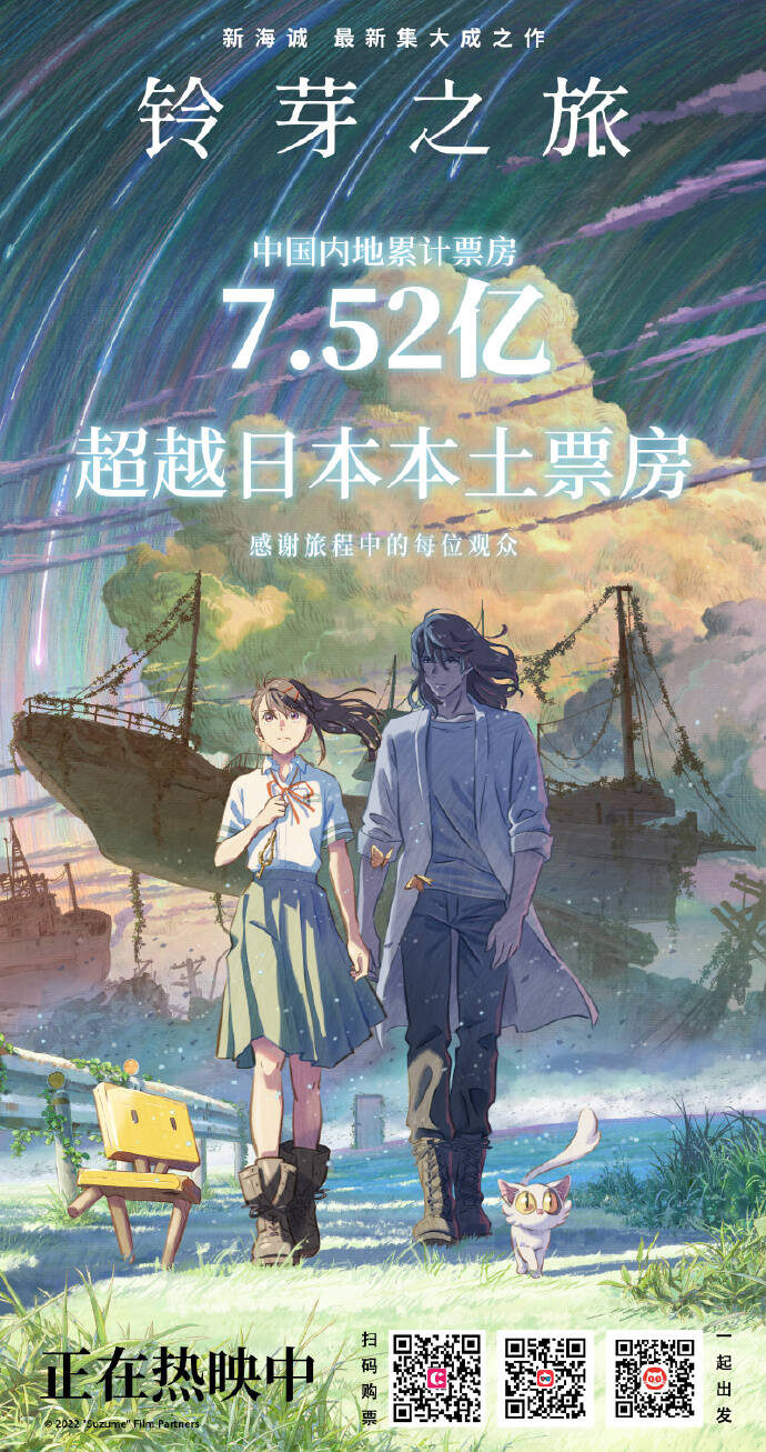 《铃芽之旅》中国内地累计票房7.52亿,超越日本本土票房!