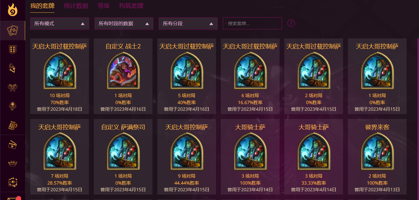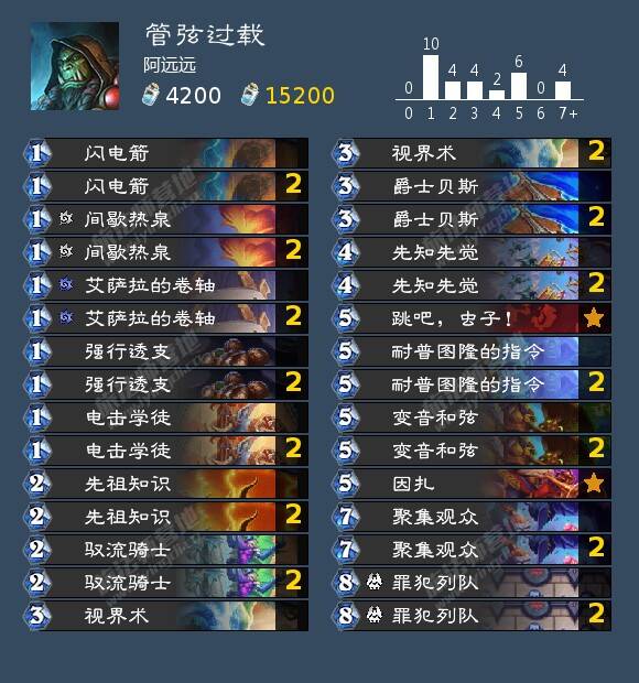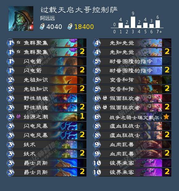 火石记牌器有个特点是就算卡组只换一张卡牌都会重新计算卡组的胜率。所以为了弥补这卡组的漏洞,我调整过很多卡牌,我想过养珊瑚培育师战场,闪电风暴解解杂毛,芬利换掉一手大哥或者一手烂牌......很快在慢慢的调整中我发现萨满的新武器爵士贝斯可以给彼界来客减费,那不就可以加速启动了吗。有了这个想法之后就开始用更纯的过载体系加入进来,去掉了大王大帝无敌,更注重加速触发天启的效果,慢慢卡组的手牌利用率变的越来越高,也更敢用先祖过牌了......但即使在每一次调整后都能感觉到漏洞已经越来越小了,开始一场对局后总能把我打回原形,这个时候胜率也就40%,虽然比前面几次调整要搞一丢丢,但无疑还是给满腔热忱的我泼了一盆凉水(所以倒头玩回了战士,一把之后关闭炉石)