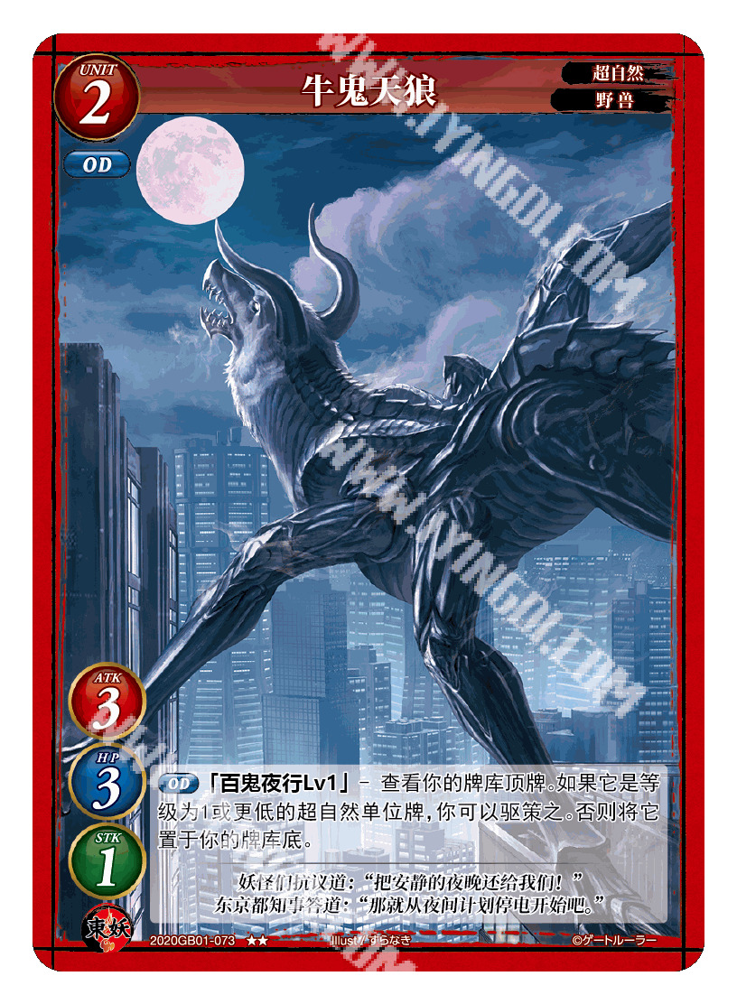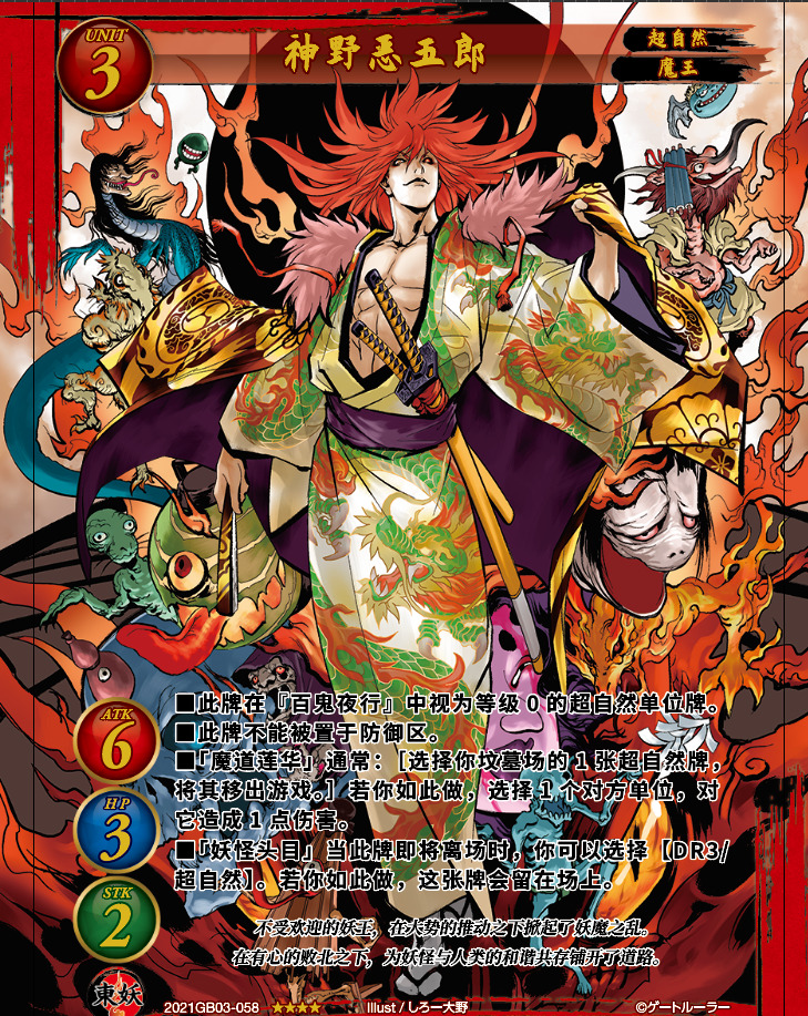 稻生物怪录中所说的大妖,无法抑制邪恶之意的怪异……率领着被称为“魔者”的人们的妖怪的首领之一,神野恶五郎发起的妖怪战争。