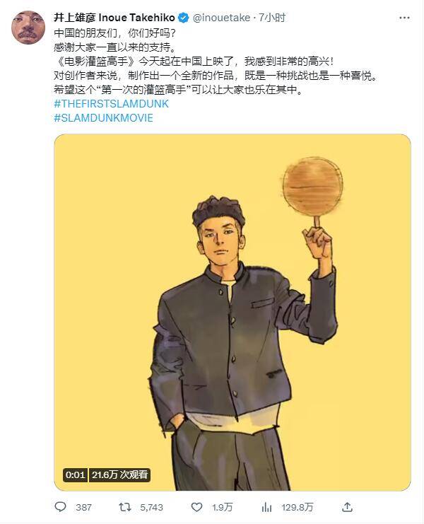 中国的朋友们,你们好吗? 感谢大家一直以来的支持。 《电影灌篮高手》今天起在中国上映了,我感到非常的高兴! 对创作者来说,制作出一个全新的作品,既是一种挑战也是一种喜悦。 希望这个“第一次的灌篮高手”可以让大家也乐在其中。