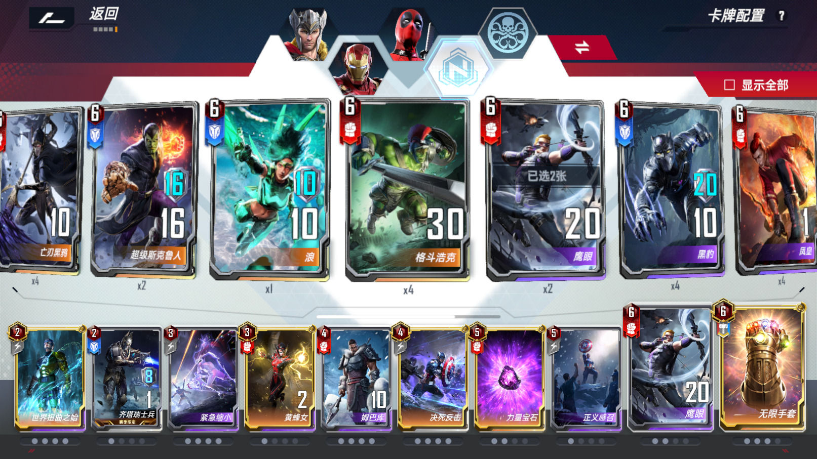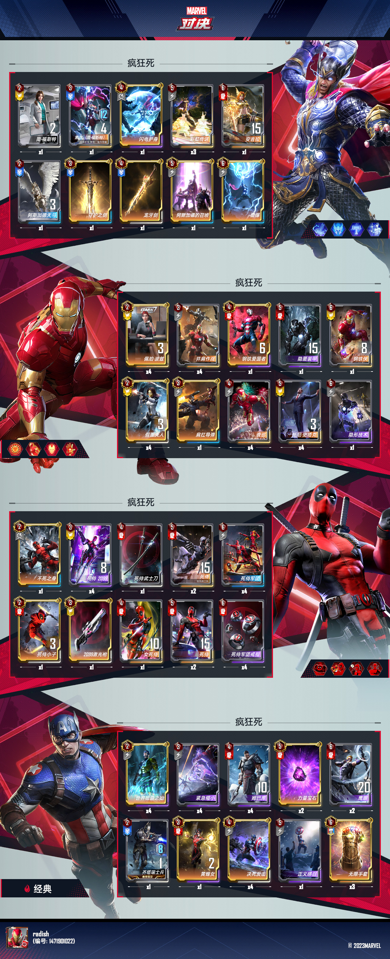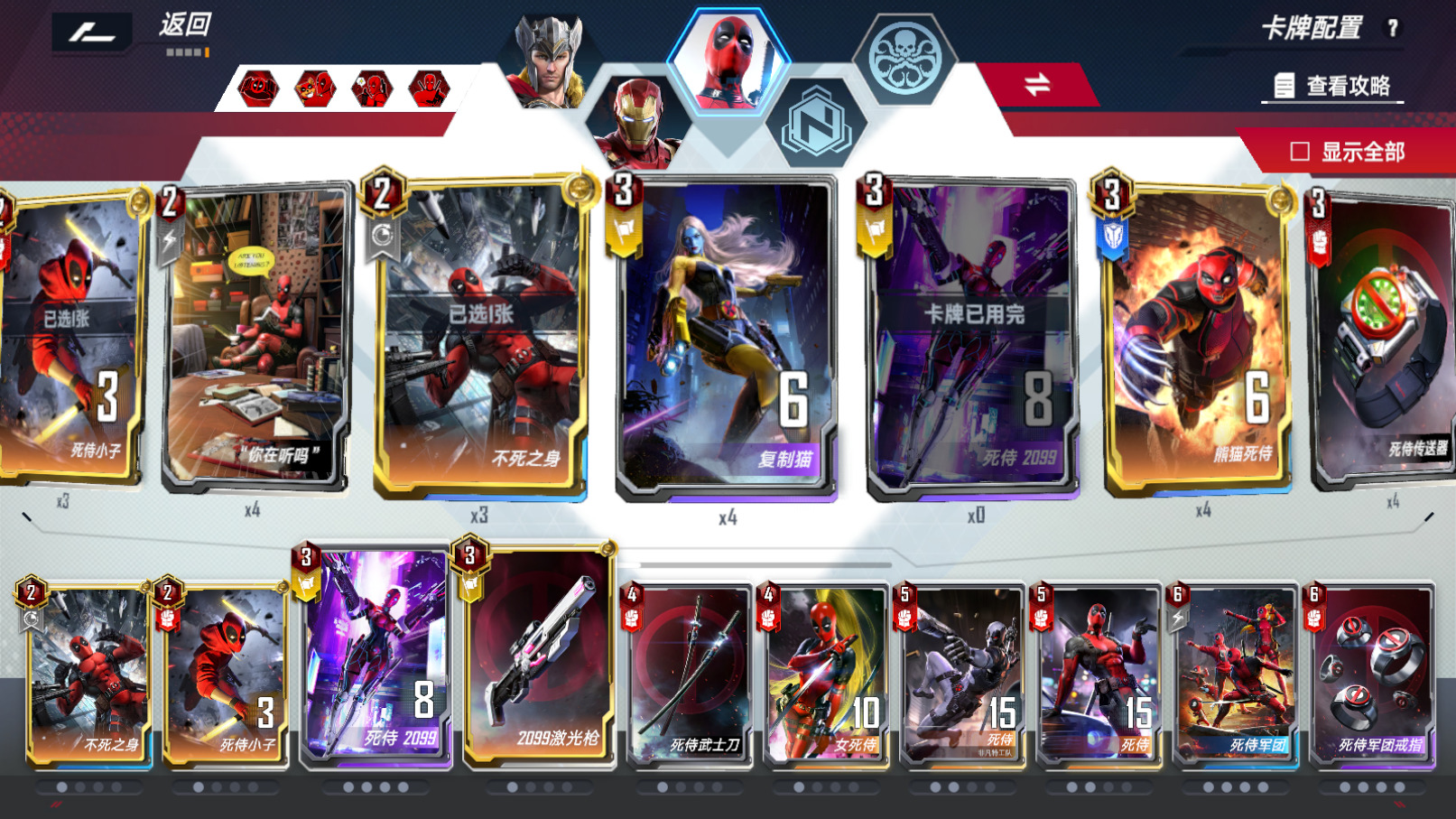 - 2费,这里来解释一下为什么不带小小。经过测试,小小和死侍模仿链接极度不契合,本卡组三个死侍角色,红白死和2099几乎固定了疯点子的位置,实战中笔者经常因为小小被链接疯到,而白死或2099没有被疯到而被飞到血入。小小虽然在前期非常克制飞刀,但在本卡组中容易被随机疯点子而无法触发效果,反而打不过飞刀,并且带四张严重臃肿影响找齐假面的进度,故舍弃。