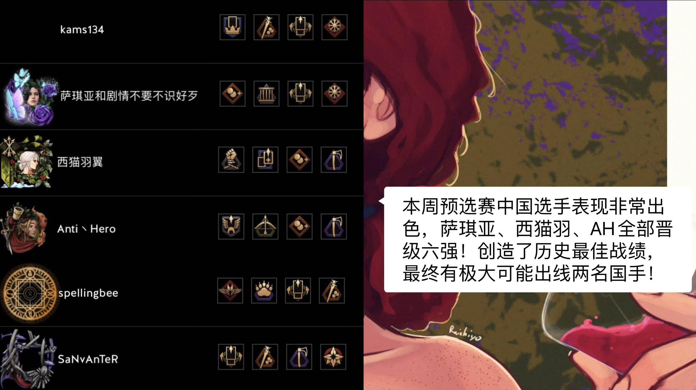 在昨晚的TOP16预选赛中,三名参赛国手没有一个被淘汰,全部挺进六强,这创造了历史以来的最佳成绩,属于CN昆特的新时代已经到来!