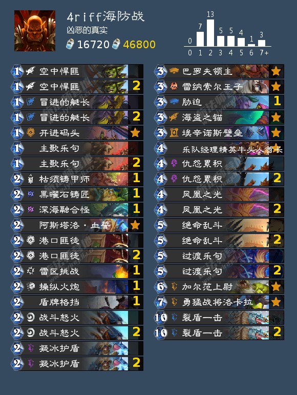 萨:小优。打偶数萨好打,打战吼萨略难。面对后者能不解场就不解,压力给足抢死才是胜利的方程式。有了riff之后面对战吼萨进攻性更强,而且不容易被破坏,最后冲击前两百就弹riff弹死两个战吼萨。起手留牌:各种海盗,绝命乱斗,裂盾一击,巴罗夫领主1;仇怨累积,操纵火炮,雷区挑战,盾牌格挡2