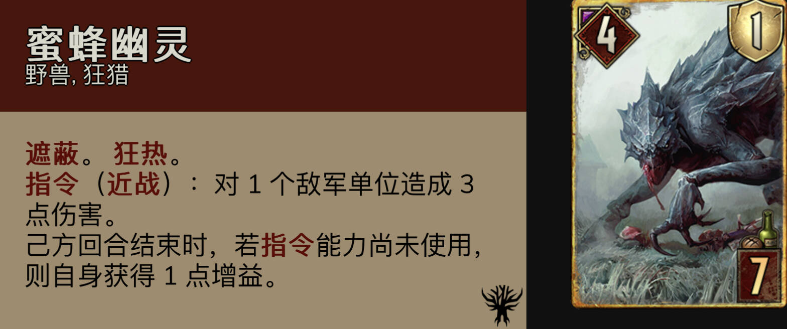 蜜蜂幽灵:很强的一张先手牌,也是霜怪为数不多的先手牌,主要用于先手压制对面,抬高自身3点斩杀线,这样子霜怪就能很轻易处理7点及以下的引擎,比如奥克温,达娜梅碧(不吃领袖或森林召唤),中邪女术士。