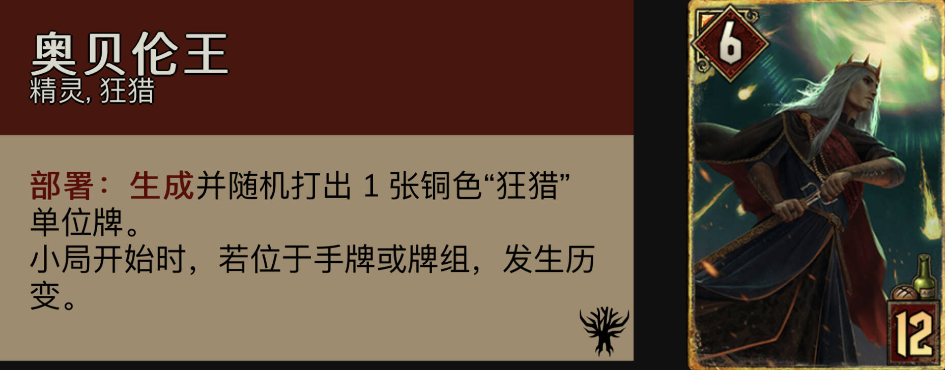 奥贝伦王:非常强的历变牌,一般留到r3先手开贵族或者短局开3骑士,开3骑士有20点的爆点,但一定要注意自己能不能统御。