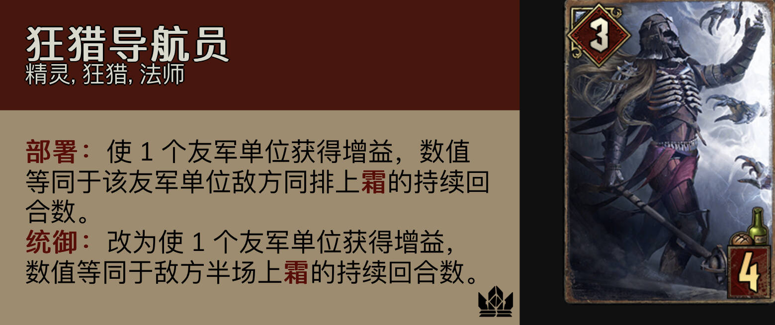 狂猎导航员:将剩余霜的收益转换为点数,手里有这张牌才建议r1存霜r2逼牌,不然存霜打法收益不高,赌奥贝伦王开导航员概率太低。