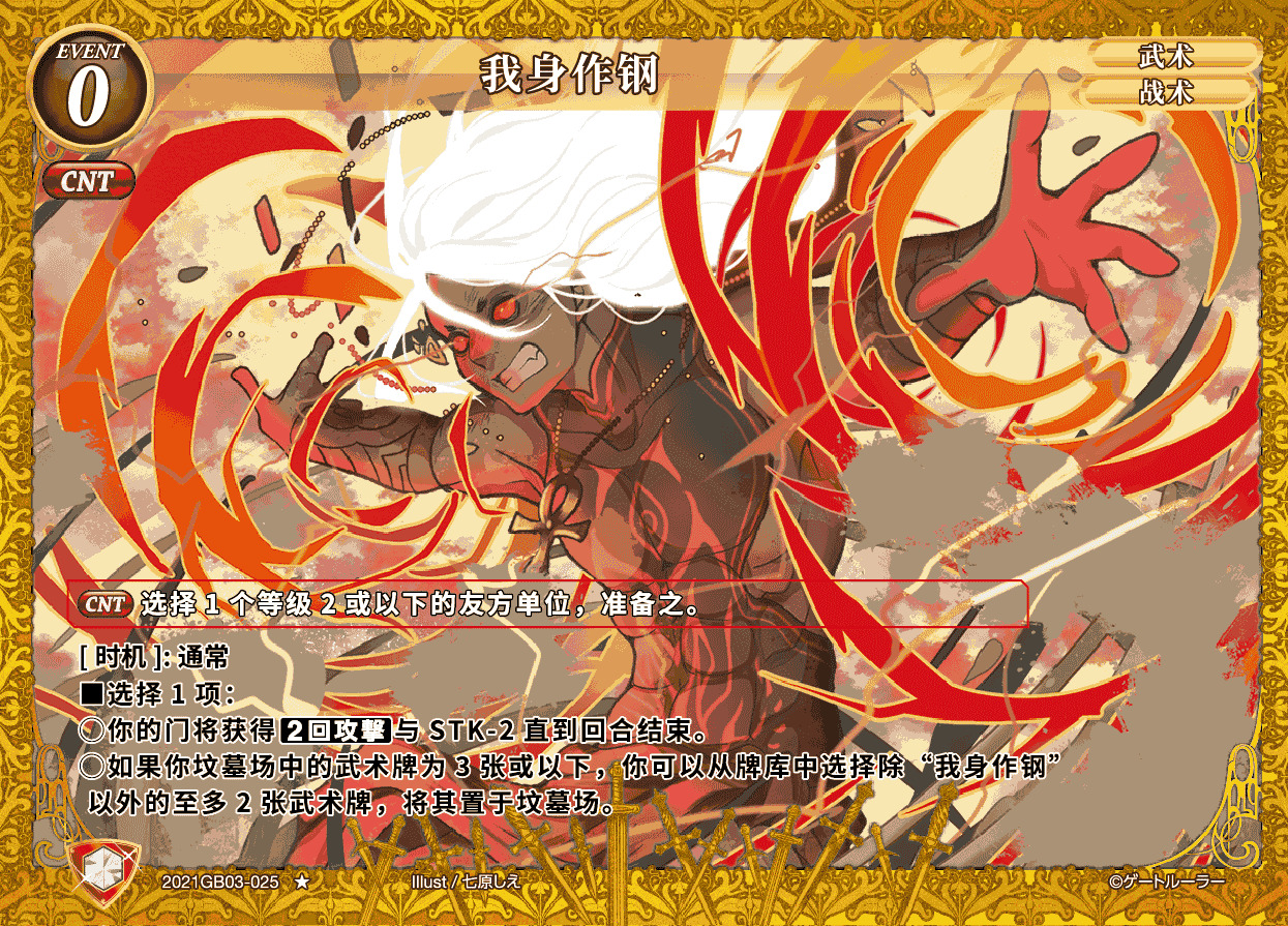 ◯如果你坟墓场中的武术牌为3张或以下,你可以从牌库中选择除“我身作钢”以外的至多2张武术牌,将其置于坟墓场。