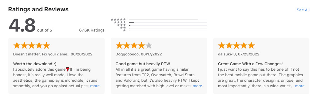 而在App store上《火力苏打》的评论区中,我们能看到更加理性且客观的观点。这些玩家严谨的分析着游戏目前的奖励还是太少,作为一款射击游戏比起击杀更追求足够有趣,这打破了他们的固有认知。但他们也毫不吝啬的赞美着游戏体验、视觉风格与他们所看到的广告完全一致,这种所见即所得的体验让他们感到分外的惊喜。即使是最为吝啬于给5星好评的App store,《火力苏打》的评分固定在了4.8分。