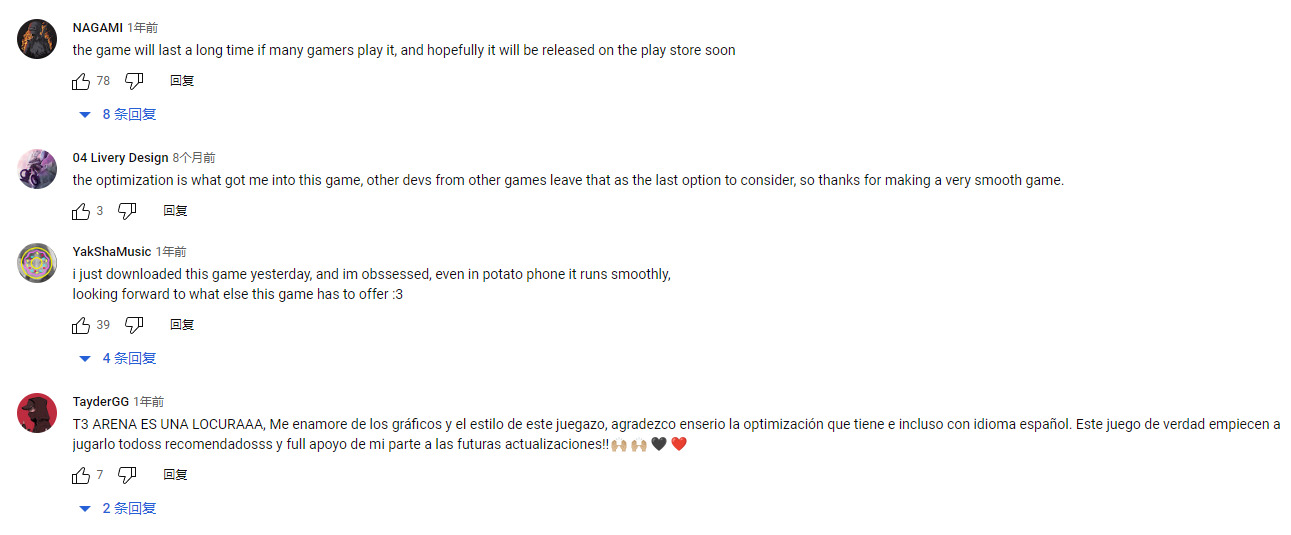 尤其是在T3 Arena频道中播放量高的一条视频下,我们能看到大批来自不同国家的热情玩家留下的各色评论。即使视频内容平平无奇,只是向玩家们展示其中一位可选英雄的实机战斗画面,评论区仍然展现了他们对游戏的喜爱。
