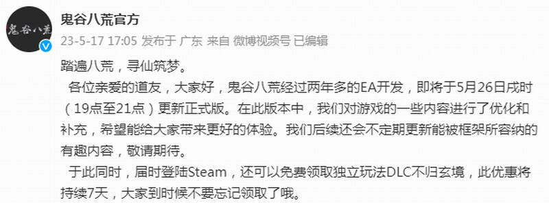 各位亲爱的道友,大家好,鬼谷八荒经过两年多的EA开发,即将于5月26日戌时(19点至21点)更新正式版。在此版本中,我们对游戏的一些内容进行了优化和补充,希望能给大家带来更好的体验。我们后续还会不定期更新能被框架所容纳的有趣内容,敬请期待。