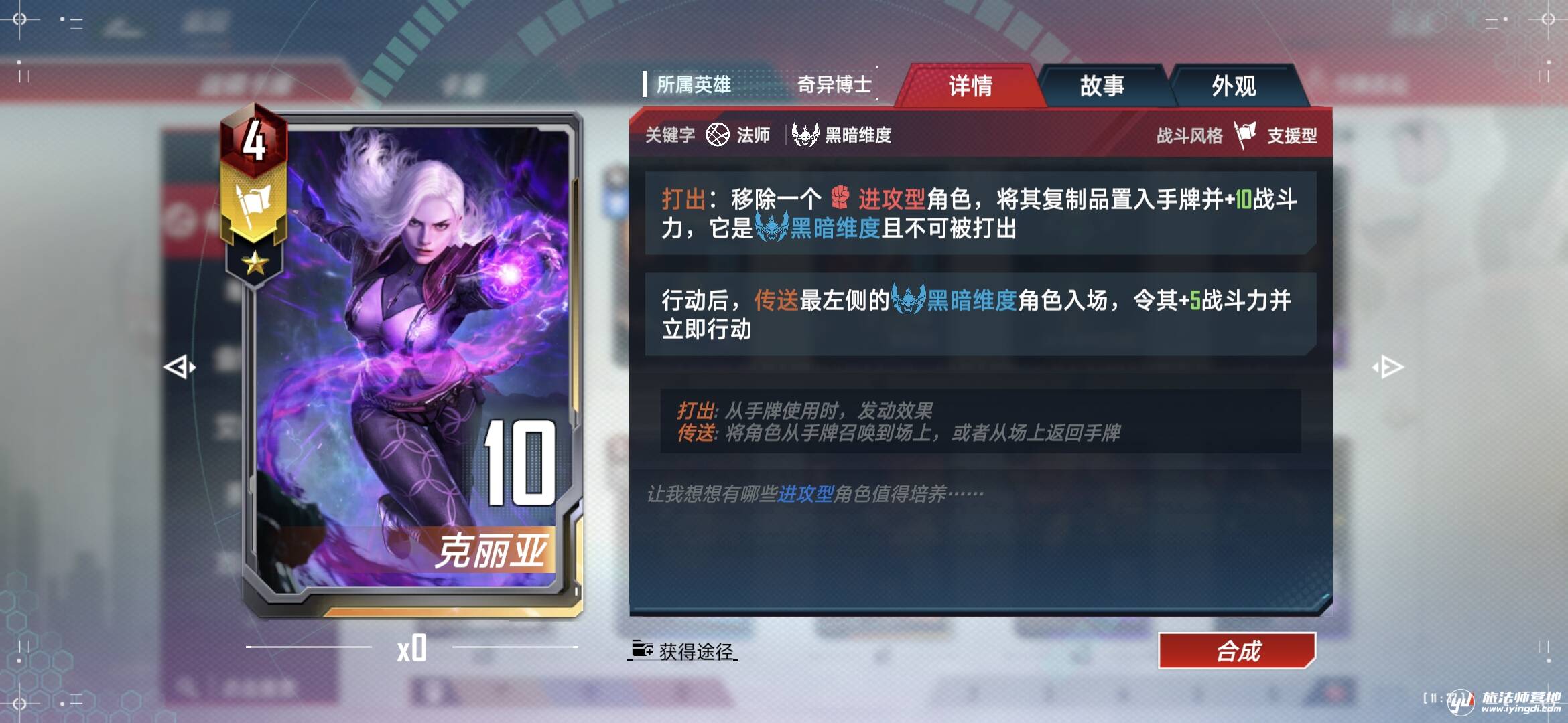 先上游戏思路:8星奥马尔在每次准备阶段结束,可以给手中卡牌加24战斗力,用奥马尔养卡,到决赛就能有数个400+战斗力;克丽亚星体召唤技能,行动两次,召唤两只黑暗维度上场,配合斗士入场可以获得极高的战斗力。因此就有了简单无脑的运营思路:一村快速给奥马尔升八星,养手中的卡,后面关卡的唯一要求就是保护克丽亚让她能够行动至少两次,召唤至少两只黑暗维度登场。是不是极为简单?