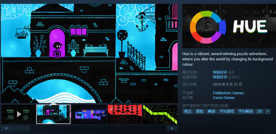 《Hue》是一款充满活力的解谜冒险游戏,玩家将探索危险的灰色土地,揭开隐藏的碎片,通过改变背景颜色来改变世界。解决刺激的谜题,踏上迷人的旅程,与许多鲜活的角色对话,了解他们的个性和故事。超过30首原声音乐,还有专业人员担纲配音。