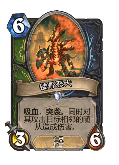双职业牌的设计往往只取两个职业的共同点,但镂骨恶犬是个例外(猎人不该吸血)。Leo表示这个设计实在很酷所以可以有。(这也是这系列里他个人的最爱……)