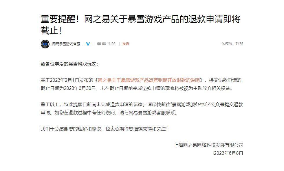 鉴于以上,特此提醒目前尚未完成退款申请的玩家,请尽快前往“暴雪游戏服务中心”公众号提交退款申请。如您在退款过程中有任何疑问,请与网易暴雪游戏客服联系。
