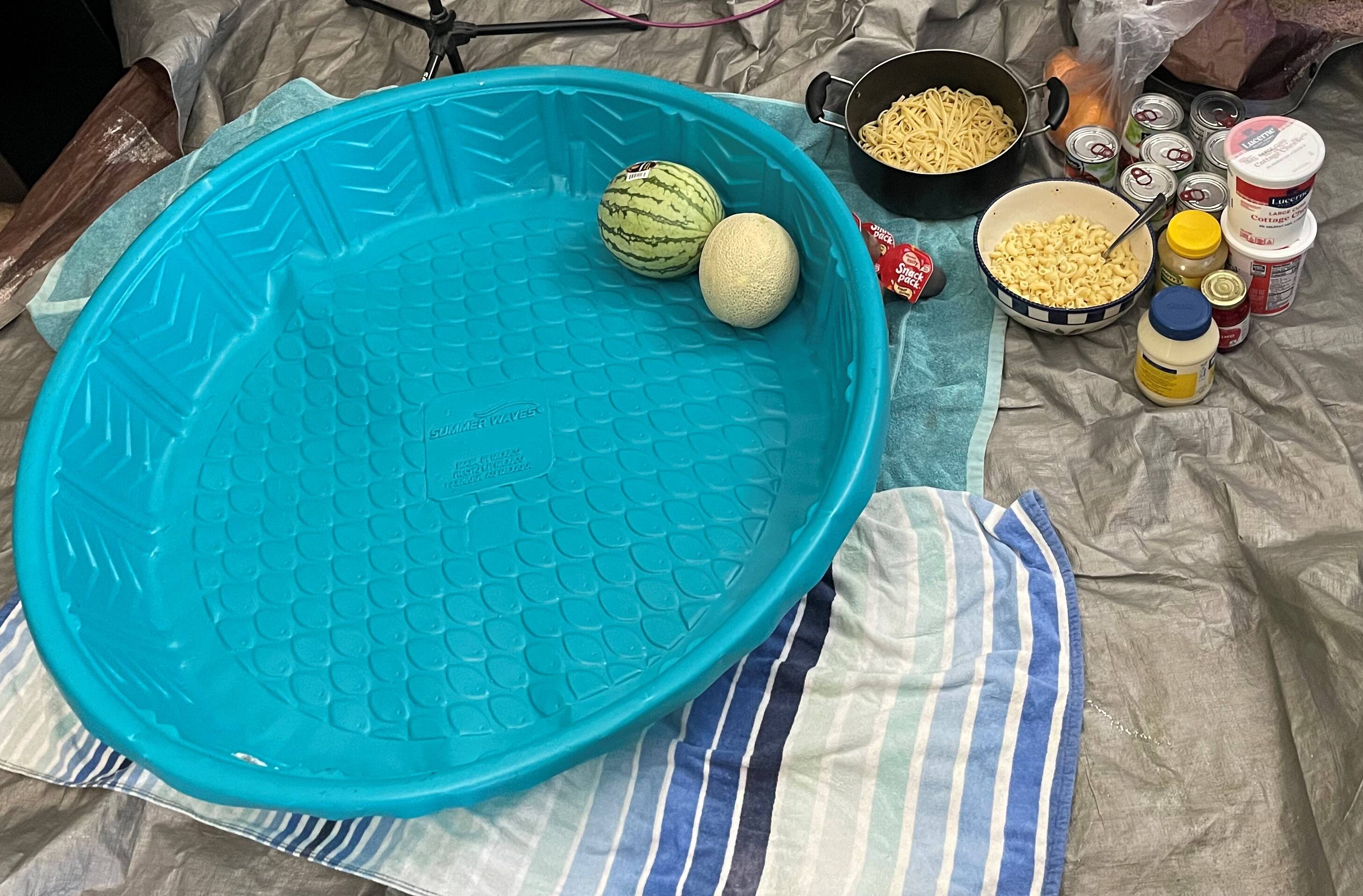 我好像在買黏糊糊的東西上花了 40 到 50 美元。然後我把我小孩的迷你泳池拿到錄音工作室裡,在下面鋪上一些防水布,然後就開始對那些東西切啊刺啊,想做啥就做啥。