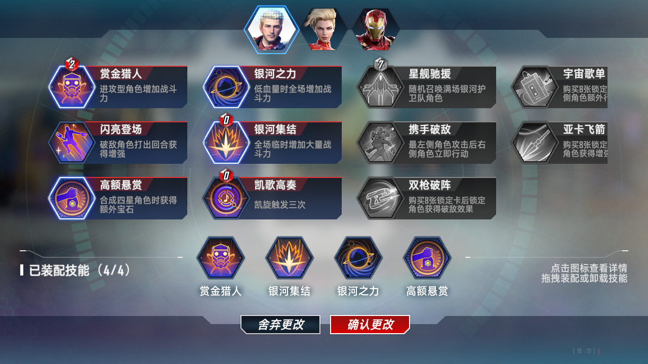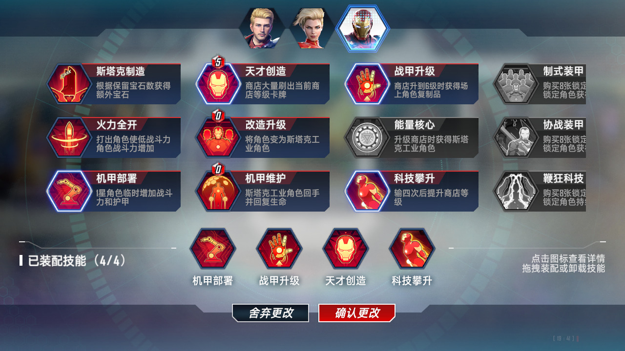 机甲部署前期过度不错。天才创造5本开收益爆炸。战甲升级有机会白拿个4星罗南,也能用。科技攀升只有前3回合输多了才会拿。机甲维护没必要,本卡组就俩斯塔克工业,机器人你留不住,钢1没一会就卖了,只能说用处不是很大,可以替换科技攀升。能量核心这技能我在特工队卡组里用过,我对他的印象很差,(没有几乎)每一局都会发现到能量波并肩肩扛,运气最好的一次拿了个万能,就算我有这个技能我也不带。