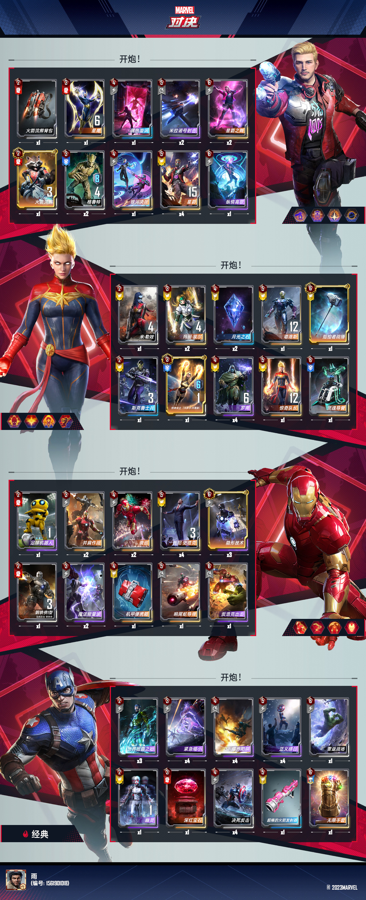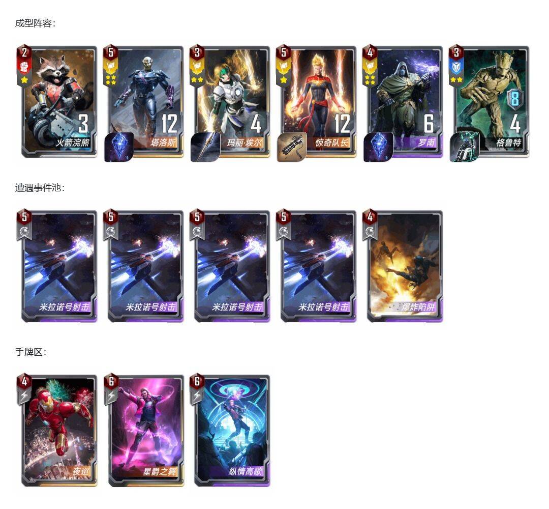 星爵技能没什么有用的,可能也就携手和银河集结偶尔有用吧。本卡组4星也就一个罗南,高额悬赏用处也不大。给4块才会考虑。开炮这张卡和星爵现有体系很不融洽。