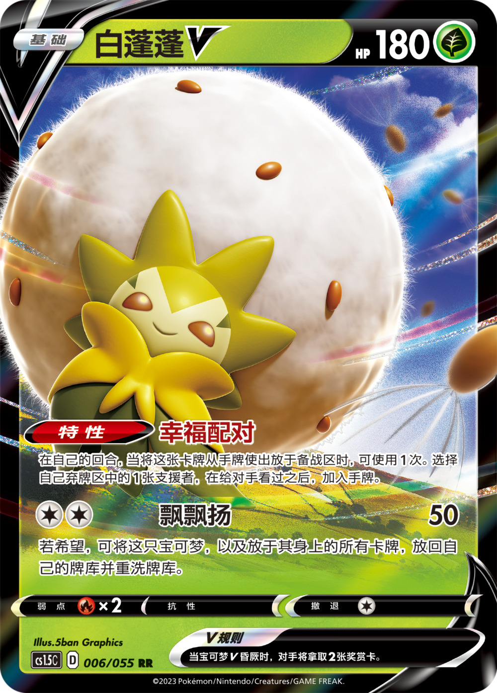 招式【飘飘扬】只需要2个无属性能量便能发动,除了会造成50点伤害之外,还能让自己及放于身上的卡牌回到牌库。之后再让白蓬蓬V从手牌中登场,便能再次发动【幸福配对】,是非常灵活且好用的招式。