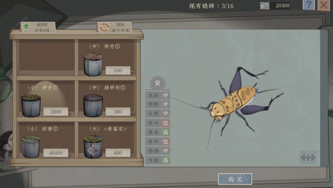 另外,游戏中还有一个蟋蟀市场,里面有大中小三种不同体型的蟋蟀,这个蟋蟀市场每天都会更新各种品相的蟋蟀,并且玩家还可以通过升级市场来解锁更高等级的蟋蟀。