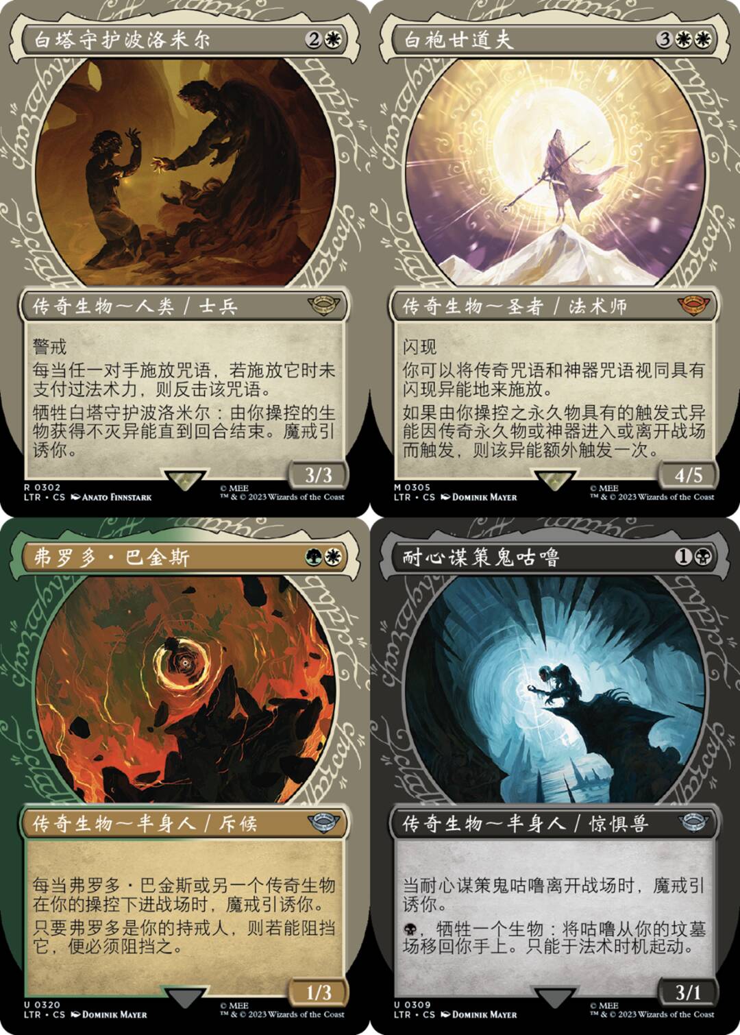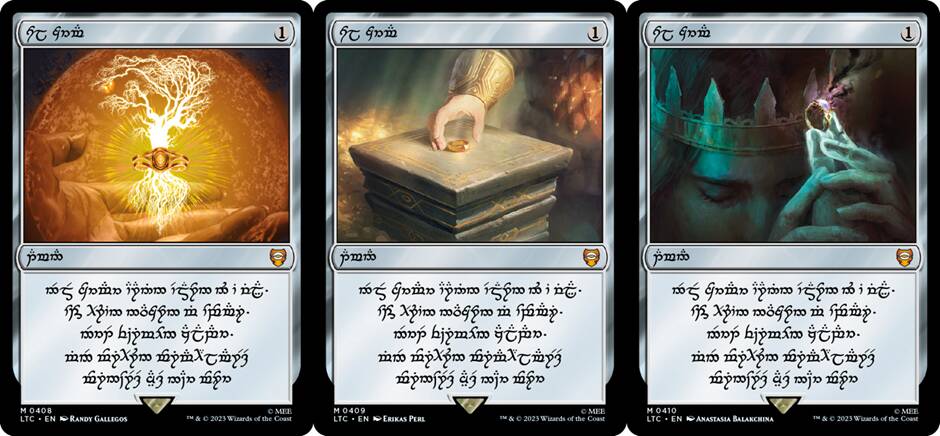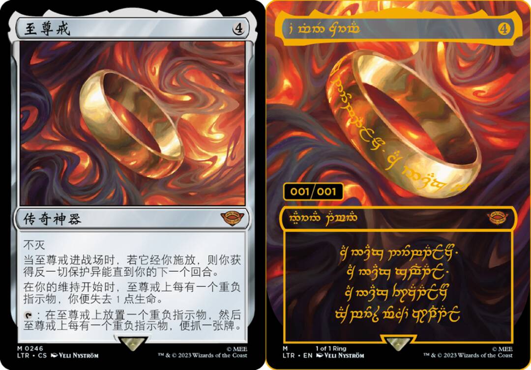 《魔戒》原著引人入胜的亮点之一,就是展现了各种角色在遭受至尊戒引诱下的不同表现。万智牌将至尊戒对角色们的影响,通过不同的牌框展现了出来。设计团队经过仔细研究,最终选出了30位魔戒中传奇角色成为万智牌中的“传奇生物”,他们的行为和动机或多或少地受到过至尊戒力量的影响。这些牌拥有全新的插画和独特的牌框,旨在凸显这30位代表人物的不同性格特点。