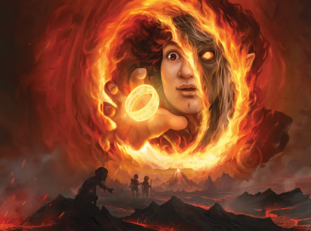 不仅如此,你还能在本系列中找到《魔戒》故事的诸多剪影。将一些无边框卡牌组合起来,原著的经典场景会悄然出现在你的面前,例如下面这组牌就展示了至尊戒毁灭的前一瞬。