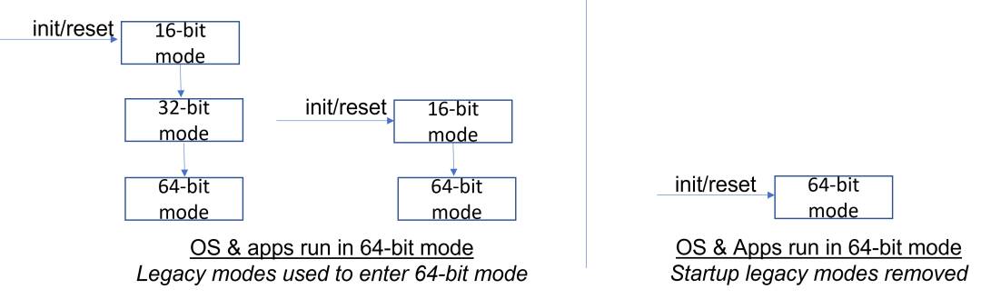 而这次的 x86S 最重要的一点变化,就是砍掉了这个 “逐级模拟” 模式,起手直接进入 64 位模式干活。