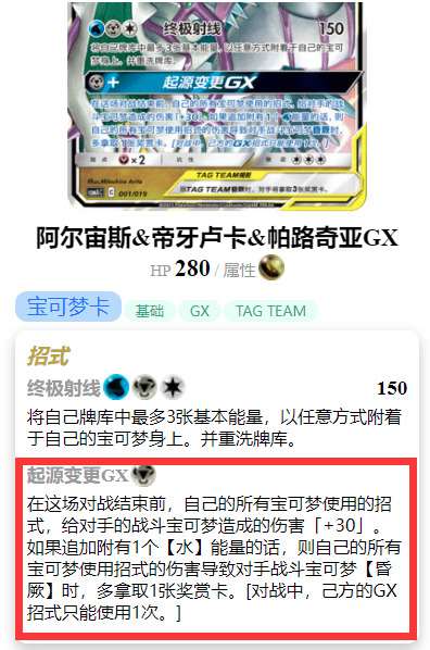 但是很可惜宝可梦存在属性克制关系,而仙属性的布鲁皇正是龙属性的阿尔宙斯&帝牙卢卡&帕路奇亚GX 的绝对天敌,腾空手牌的情况下的致命一击,160的打点由于克属带来的伤害翻倍,320点的高额伤害是对方绝对无法承受的。