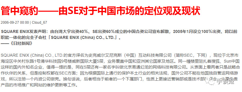 2007年,就在日服开服一年后,SE将游戏带到了中国大陆,并交由北京易通幻龙网络科技有限公司发行。从当时的相关报道来看,易通是SE全资控股的公司,是为了规避国外公司不能在中国大**自营运网络游戏政策而整出的壳公司。