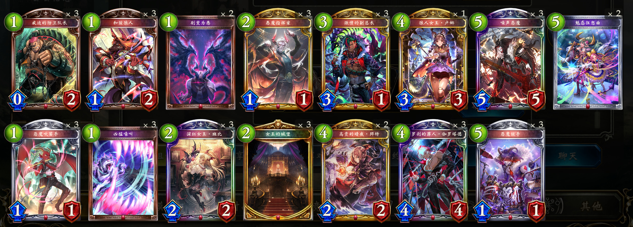 八狱妖是一个标准的组合技卡组,其制胜方式是刷取四回合四连击任务,在第七回合甚至第六回合冲出罪人和其他八狱随从,由罪人提供全体疾驰和buff进行冲脸OTK。