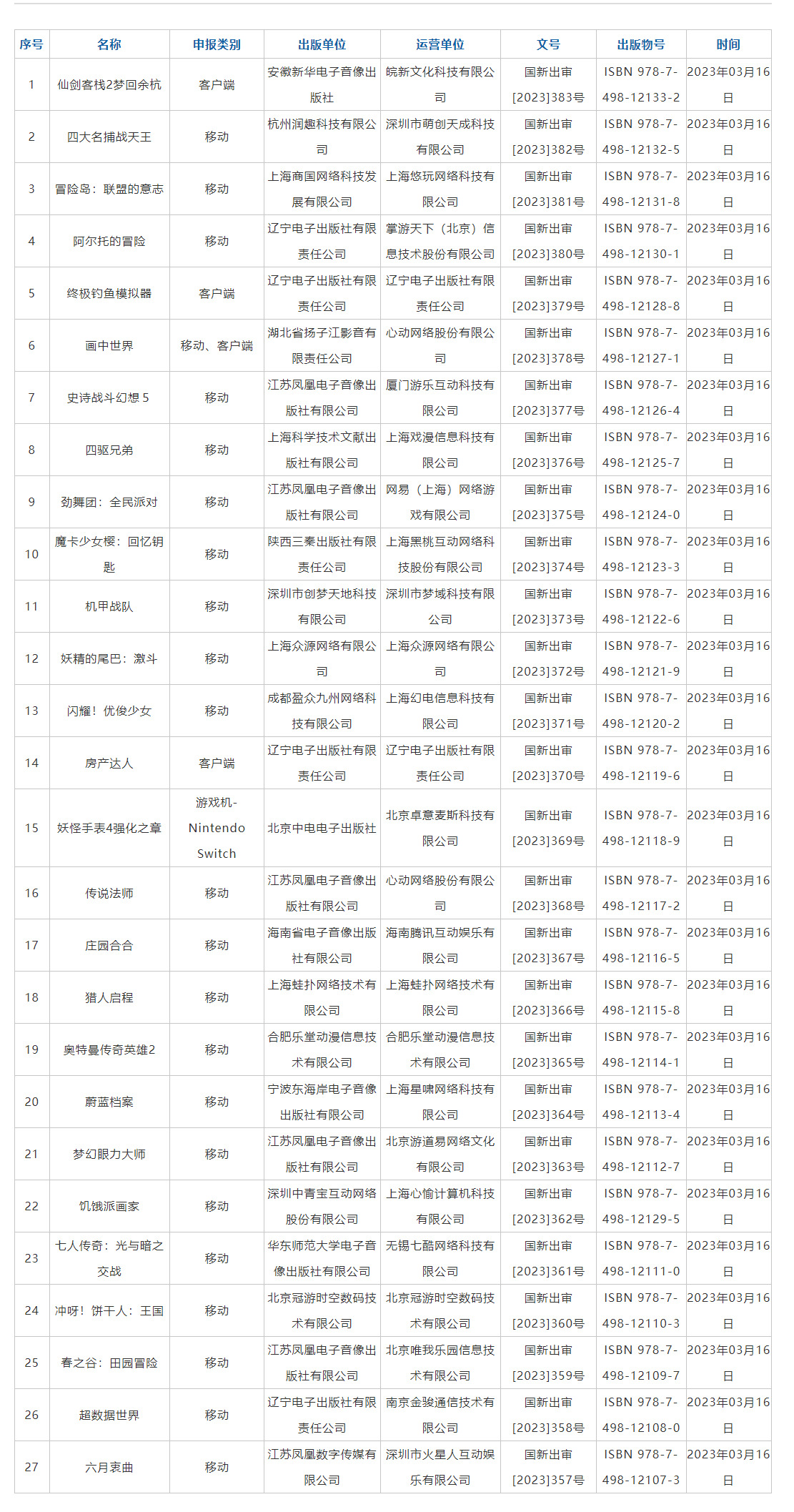 3月20日晚,国家新闻出版总署公布了2023年3月份进口网络游戏审批信息,共有27款游戏过审。其中包括《仙剑客栈2梦回余杭》、《闪耀!优俊少女》、《妖怪手表4:强化之章》 、《蔚蓝档案》 、《劲舞团:全民派对》、《传说法师》等