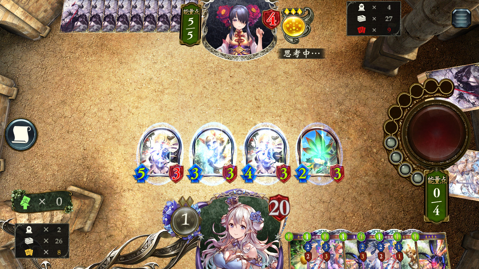 前期争夺场面。预计对手无法解场的话,优先使用妖花捕食者,可以为此在第1回合使用红叶的小叶人、奇迹的结实,以及没有目标的疾风妖精。对手可能有单解的话,则要优先横向展开,选择更合适的时机使用捕食者,并通过英雄的觉悟制造高场攻。可以为了触发觉悟效果而使用1费随从、结实。