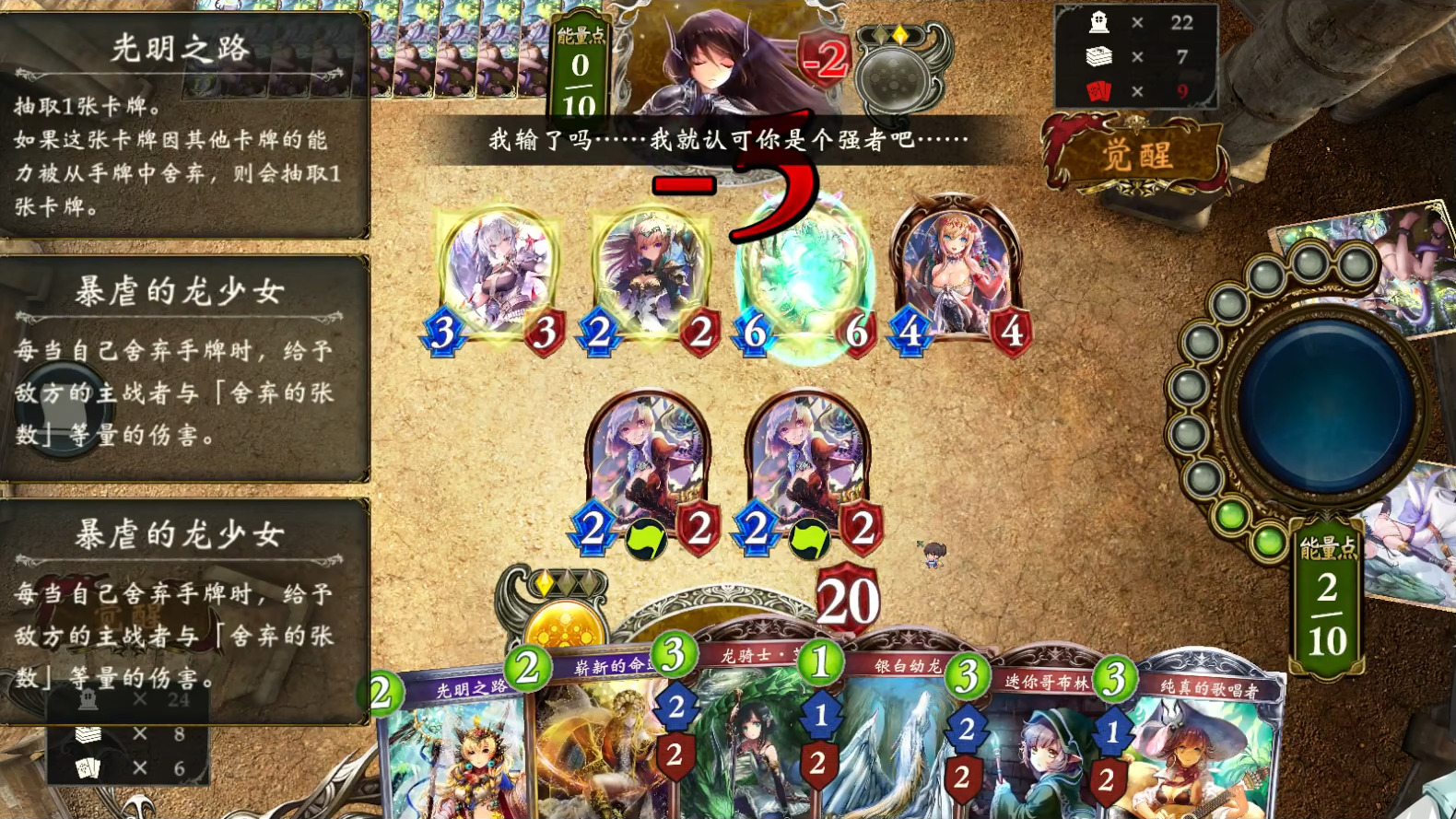 2. 只有8张手牌的情况下使用2张龙少女、新命,弃掉1张光明之路,抽到并使用第2张新命,打20。