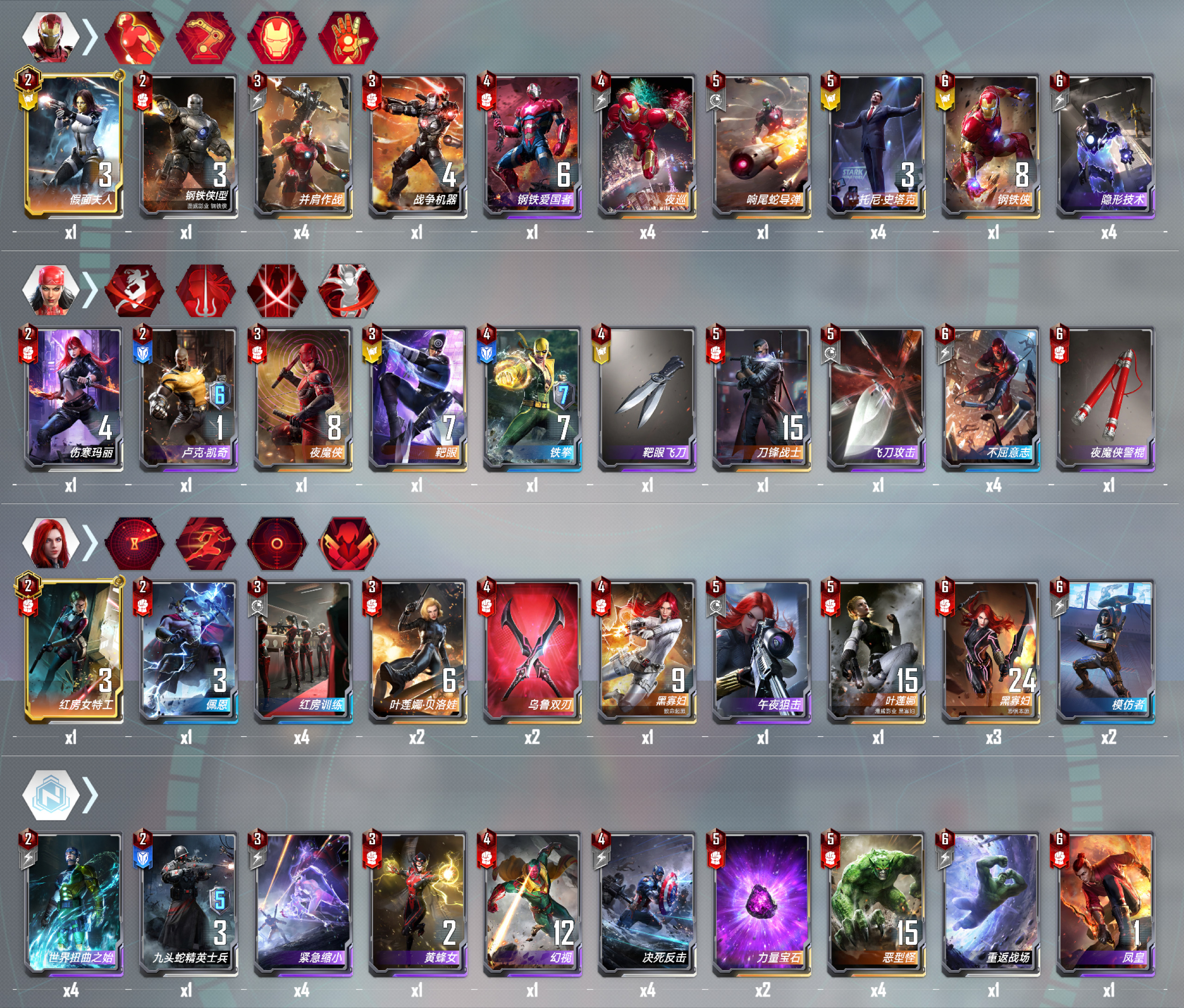 6费:隐形技术/不屈意志/模仿者带满,为保证先制阶段全情报恐惧寡带3张即可,自信点也可以带4,钢铁侠带一张为恐惧寡成型之前过度,其他过度卡带一张