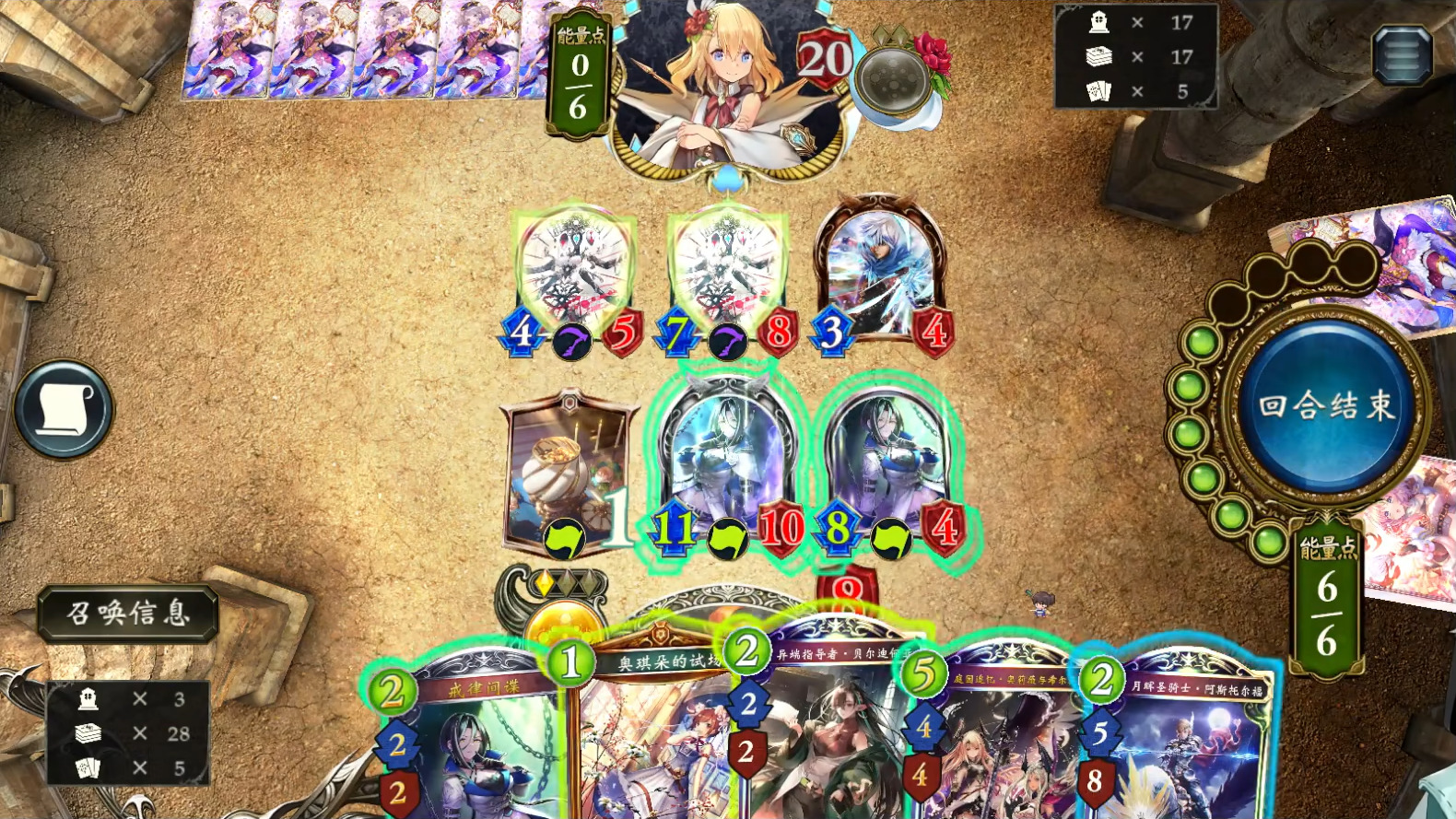手中没有耶伦毕菈的话,前期尽快使用恒心少女·琪蓝。已有耶伦毕菈的话,优先使用阿兹弗特,或结晶阿斯托尔福解场、过牌。费用比较充裕的话(先手,或后手时手牌难以快速取胜的情况下),还可使用班布蒂的试场(奥琪朵的试场)过牌,或麻姆的试场解场。