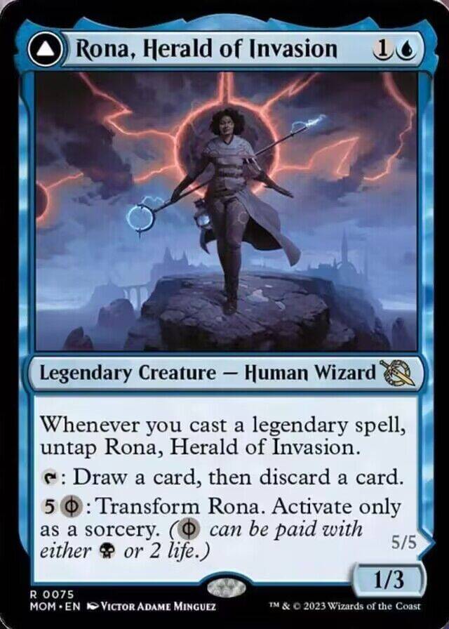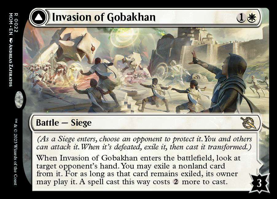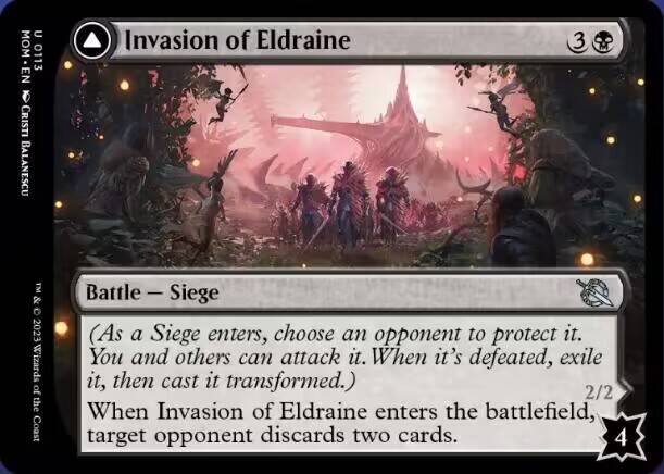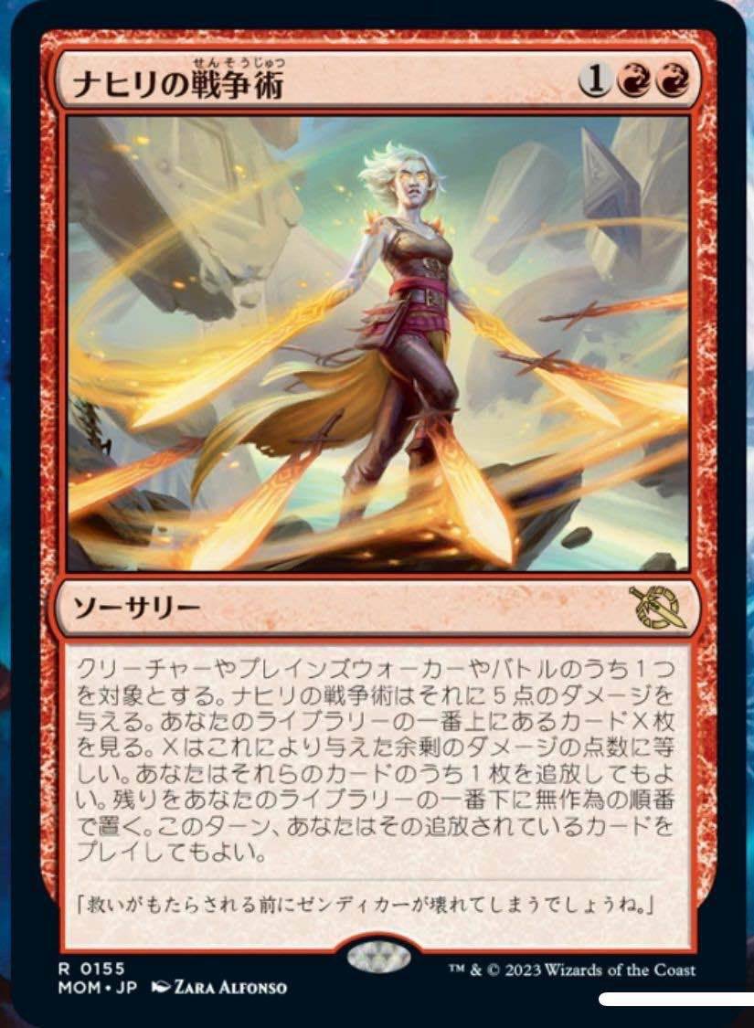 法术,打目标生物、鹏洛客或战役5。你检视牌库顶X张牌,X为过量伤害。可以放逐其中一张,其余随机顺序放到牌库底。本回合你可以使用以此法放逐的牌。