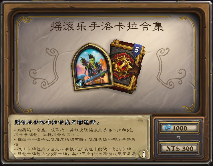 含构筑模式战士新皮肤“摇滚乐手洛卡拉”和5战士包,售价1000符文石。