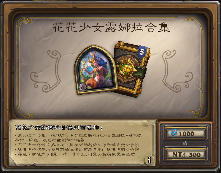 含构筑模式德鲁伊新皮肤“花花少女露娜拉”和5德鲁伊包,售价1000符文石。